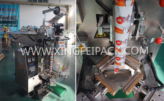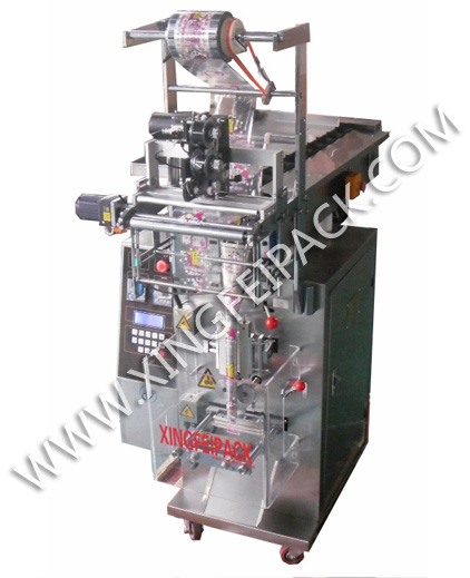 自動鏈斗式包裝機可自動完成計量、填充、封口、打?。ㄐ枇砼浯虼a機)等周期作業(yè);集光電跟蹤、無級調(diào)速等功能于一體;封口形式為背封;