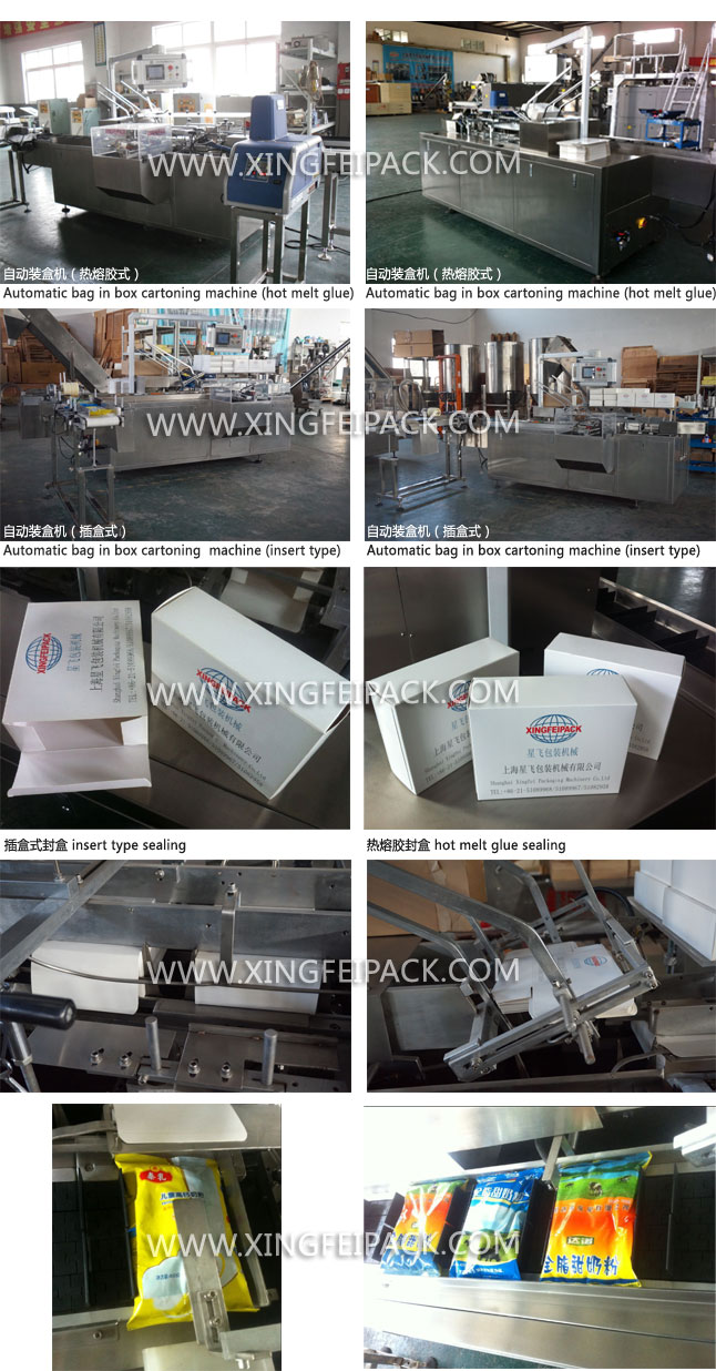 本機適用于袋裝產(chǎn)品的包裝,能自動完成袋子輸送,紙盒供應,打開,袋子裝盒,封盒等工作。有兩種封盒形式可供選擇:插盒,熱熔膠。